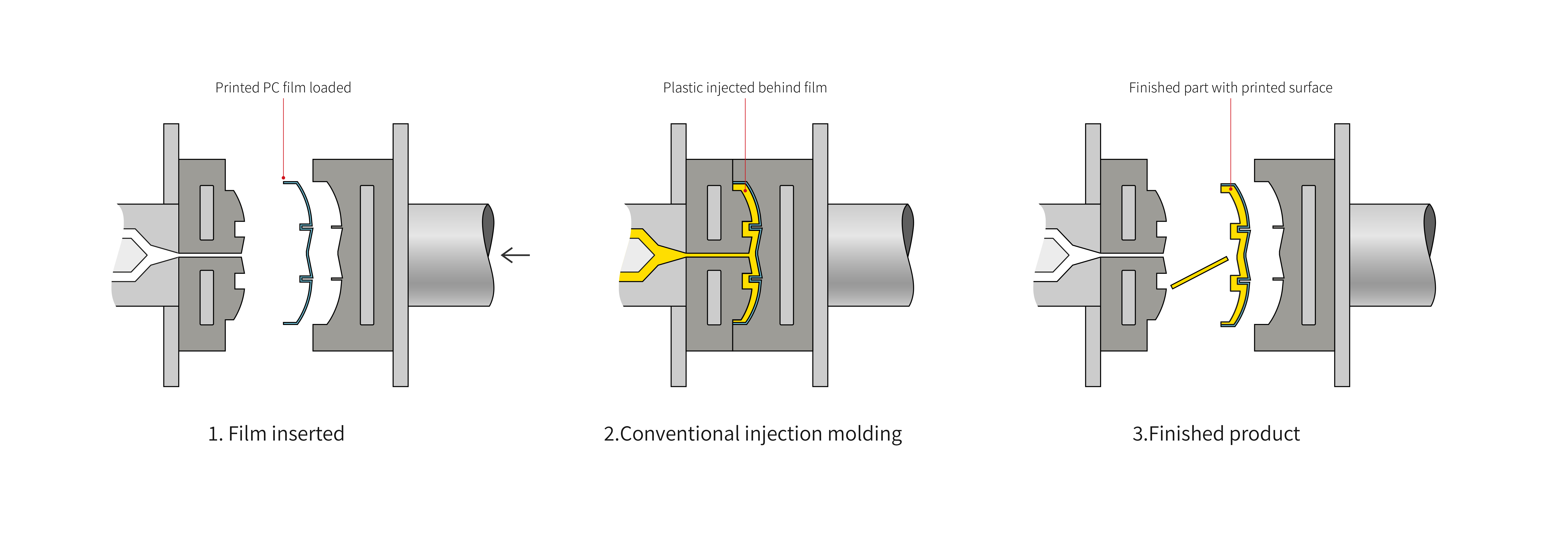 | 1.스크린프린팅한 도안을 진공성형으로 모양을 만든다. 2.의도한 부분만 제외하고 잘라낸뒤 금형에 배치 후 사출을 하여 하나의 제품으로 만든다. |